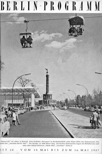 Im Wettstreit der Systeme entstanden im zerstörten Berlin zwei Neubauviertel, im Osten (beeinflusst durch russische Bauten und in Schinkelscher Tradition) die Stalinallee (heute Karl-Marx-Allee), im Westen im Rahmen der Internationalen Bauausstellung 1957 das der Moderne verpflichtete Hansaviertel am Rande des Tiergartens. Der Chef und ich waren damals Kinder, unser Interesse an den Bauwerken hielt sich in Grenzen, aber der Sessellift auf der IBA war eine Attraktion. Die Strecke führte über knapp anderthalb Kilometer vom Zoo bis zum Schloss Bellevue, in einer Höhe von 5 bis 12 Metern. Die Fahrt mit dem Sessellift war das erste gemeinsame Erlebnis vom (späteren) Chef und seinem (späteren) Mitarbeiter. Nur dass wir uns damals natürlich noch nicht kannten. Es dauerte 50 Jahre, bis wir voneinander erfuhren, dass wir in der Kindheit ein Abenteuer geteilt hatten.